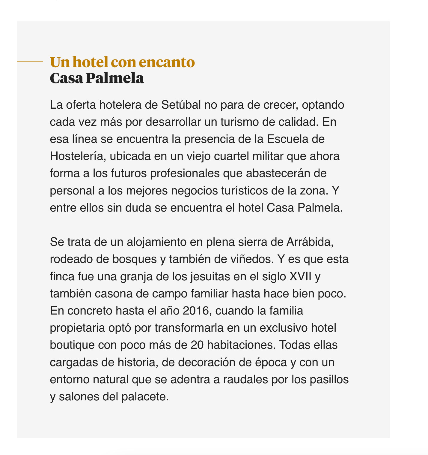 A oferta hoteleira de Setúbal não pára de crescer, apostando cada vez mais no desenvolvimento de um turismo de qualidade. Nesse sentido, destaca-se a presença da Escola de Hotelaria, situada num antigo quartel militar que agora forma os futuros profissionais que irão abastecer com mão de obra os melhores negócios turísticos da região. E entre esses negócios está, sem dúvida, o hotel Casa Palmela.